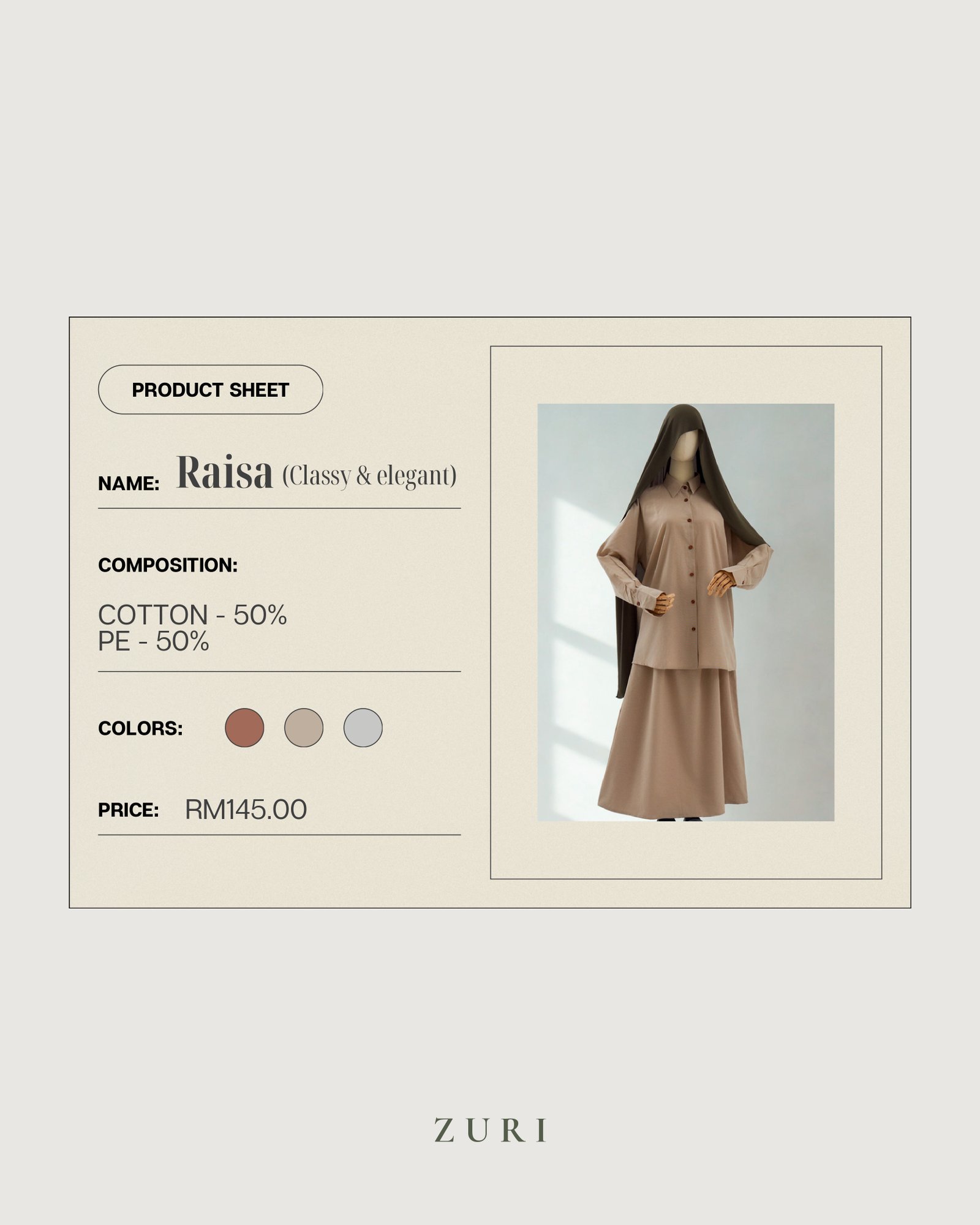 The Raisa Series by Zuri is designed for women who appreciate timeless elegance and effortless modesty. Featuring a relaxed silhouette with clean tailoring, this set offers comfort without compromising on style.